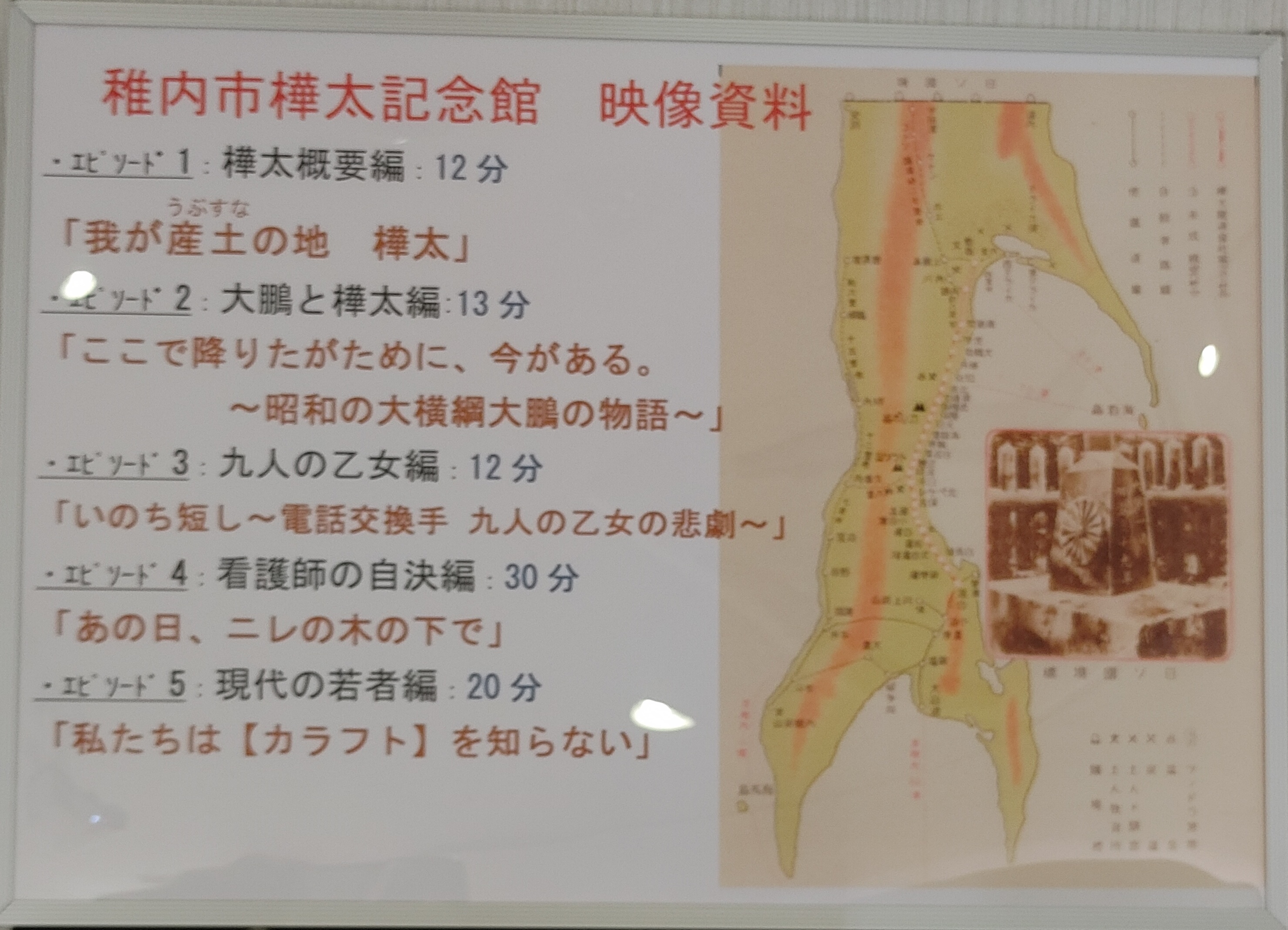 ● さて、10時になるのを待って、2階の「樺太記念館」を訪れました。ここは、今度の旅では2度目の訪問になりますが、今回は、ビデオ映像シリーズ6作品のうち、まだ観ていないNo5を鑑賞するために訪れました