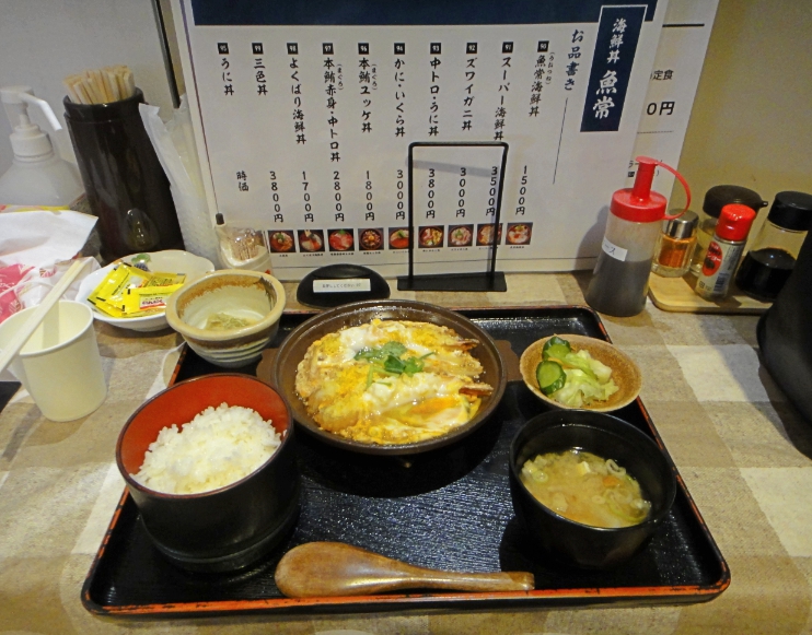 そこで、昨年秋と同じテーブルに座ると、今度は「エビ天とじ定食」1,200円(税込)を注文しました。レンタカーの返却が待っているので急いで食べましたが、このメニューもなかなか美味しかったです^^♪
