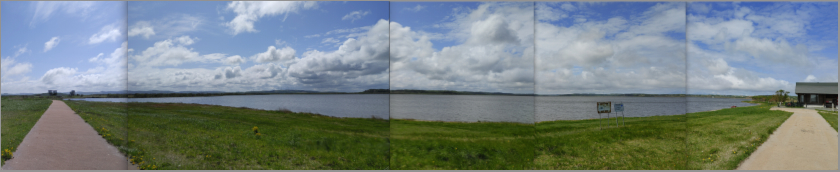 上のパノラマ画像は、すぐ上の地図で示した位置から「大沼」をグルッと180度写したものをムリクリつなぎ合わせてみました。なので画面左右の道は直線状の一本の道路です。それにしても、湖のように広い沼です(^^)