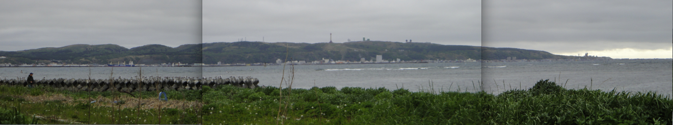 声問岬から画面中央に百年記念塔、右手にノシャップ岬を望む(左の人影が件の男性)
