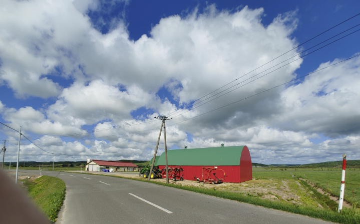 道路脇に建つこのふたつの建物は農業用倉庫のようで、どちらも牛舎ではないようです。それにしても、この建物が目にはいった瞬間、その鮮やかすぎる赤と緑の補色の配色に、一気に目を奪われてしまいました。