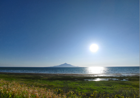 すると、やや傾いた太陽の方向に、利尻山がたたずんでいるのが目にはいりました。距離的にはけっこう離れているようで、小さい遠景でしたが、三角形状の美しい山稜がくっきりと見て取れます。